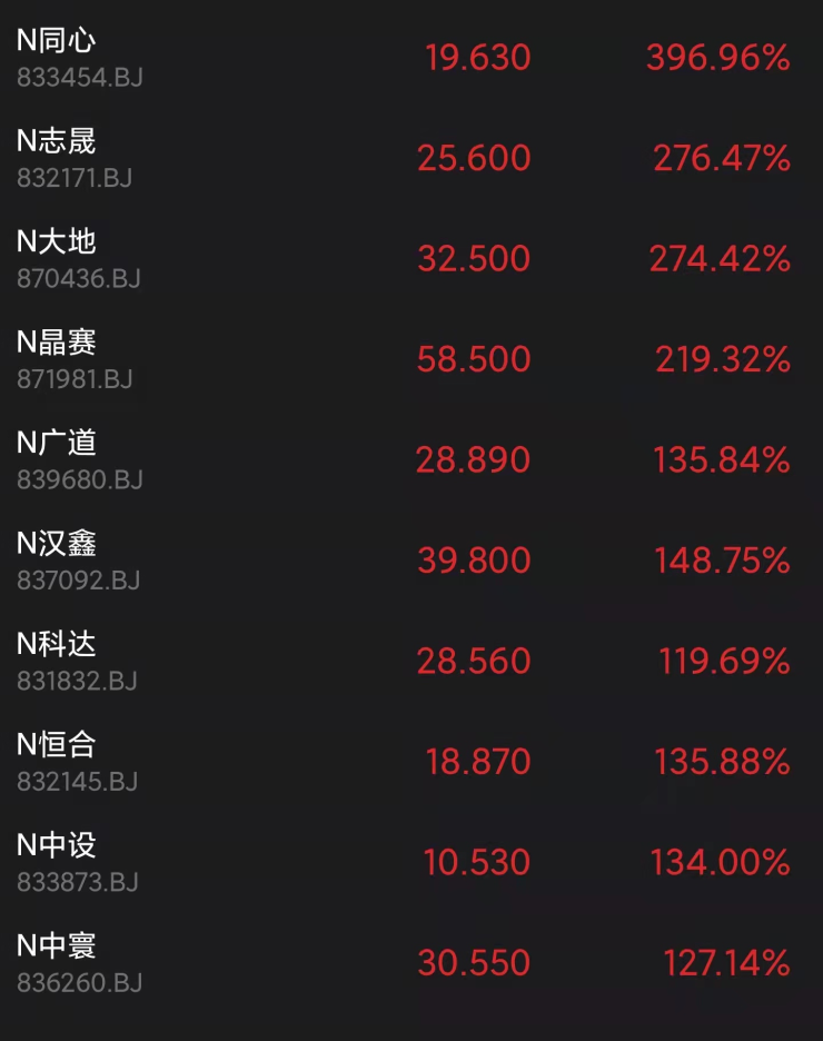 11月15日,北京交易所正式开市,10只新股集体大幅高开,截至发稿,N同心涨近400%、剩余9只新股涨幅均超100%。