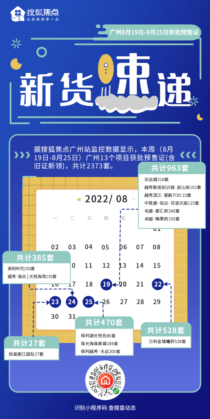 根据阳光家缘的预售证发放信息,本周(8.19-8.25)广州共有13个项目新获预售证,合计2373套,要知道七月份和八月初每周仅有5、6个项目拿预售证。