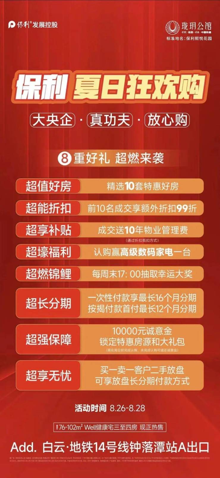 白云保利珑玥公馆推出“夏日狂欢购”8重好礼,其中包括精选十套特价房源,成交前10名享受额外99折,10年物业管理费,数码家电等等......