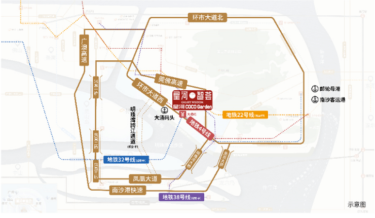 项目紧邻着地铁4号线大涌站旁,直线距离仅约200米。未来周边还有地铁22号线(南延线规划中)、32号线(规划中)、38号线(规划中)多条轨道交通环绕。