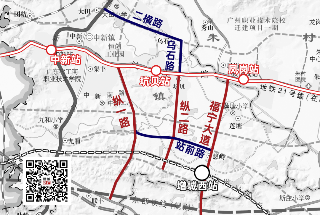 广汕南路(规划纵二路-福宁大道) 总投资约22771.70万元西起规划纵二路,东至福宁大道,主线全长约1.25km,道路红线宽60m,建设辅道双向6车道(不含高架建设,预留22m宽中央绿化带设置主线高架桥桥墩),设计时速60km/h。主要建设内容包括道路、桥梁、交通、给排水、电力管沟、照明、绿化等工程。中新产业园规划横一路(规划纵二路-福宁大道) 总投资约15866.10万元西起规划纵二路立交,东至福宁大道,主线全长约1.26km,道路红线宽40m,双向6车道。主要建设内容包括道路、交通、给排水、电力管沟、通信、照明、涵洞、绿化等工程。增城西站周边路网不断完善此前,增城西站就发布过增城西站片区路网招标的公告,公告指出建设工程设计增城西站片区-福宁大道(广汕公路至沙宁路段)及纵一路、纵二路跨铁路桥,估算总造价279727.61万元。
