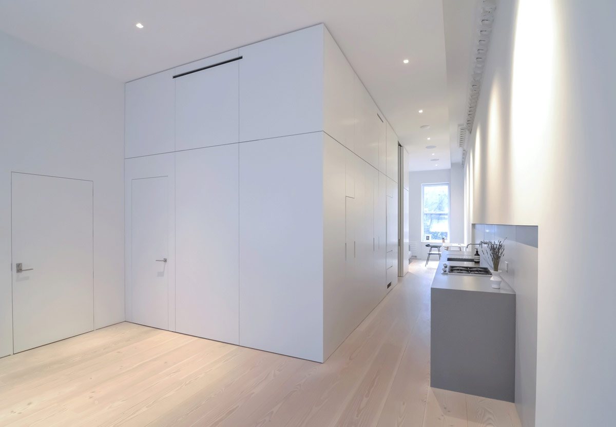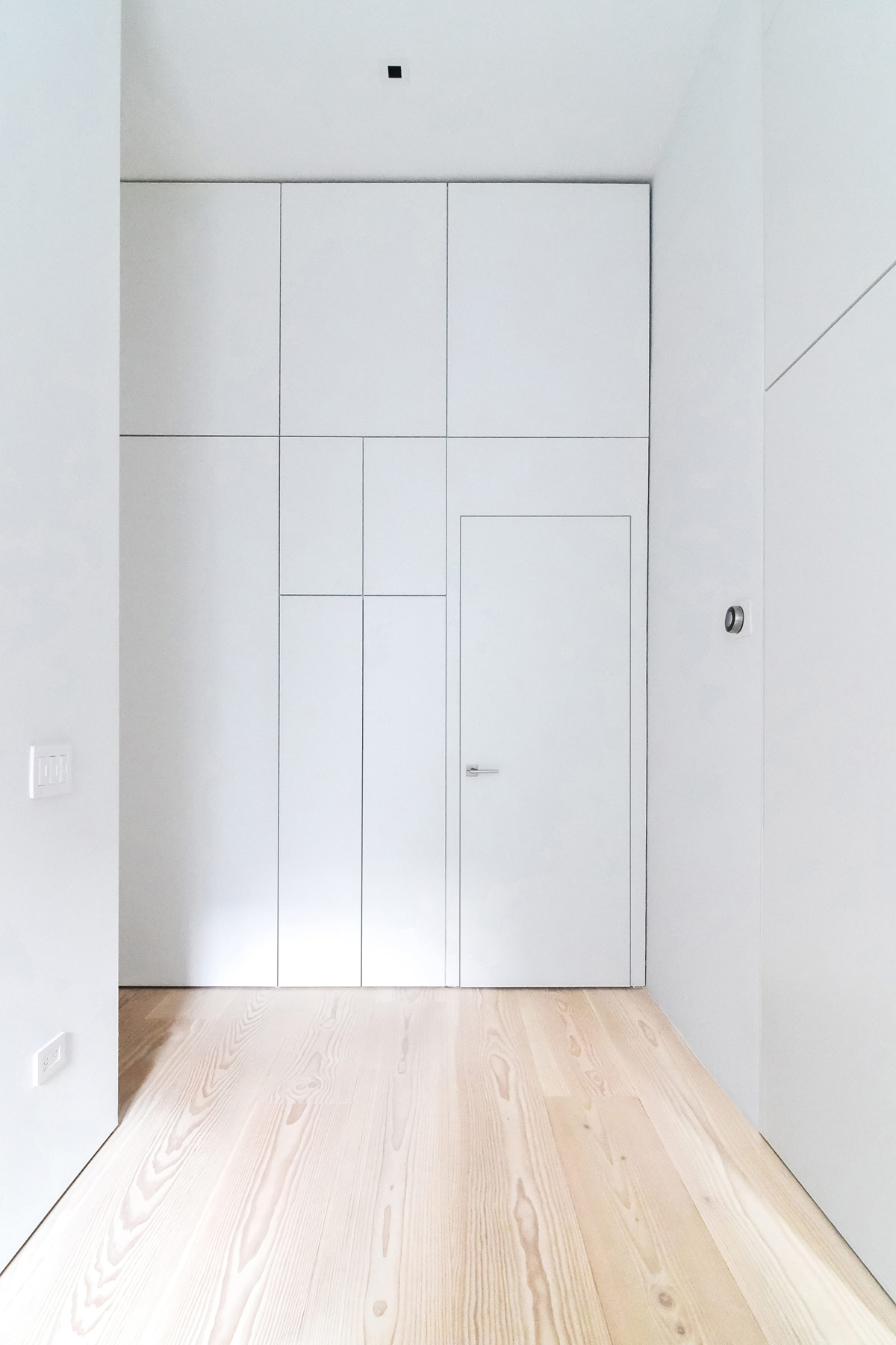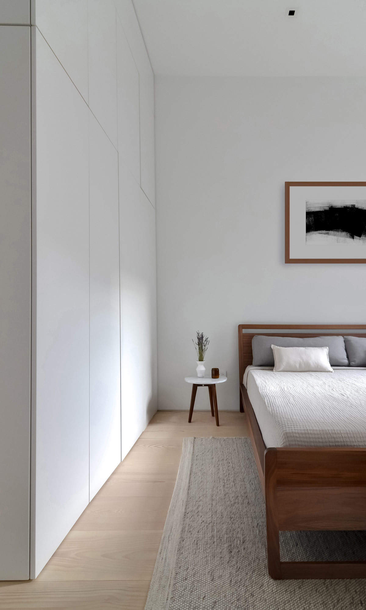 收纳柜的门与白色的墙面保持在同一平面,且柜子底部与地板齐平,避免了踢脚线增加的线条。嵌入式的手柄既简化了安装的过程又使收纳柜整体与墙面融为一体,维持了房间整体的简约设计。