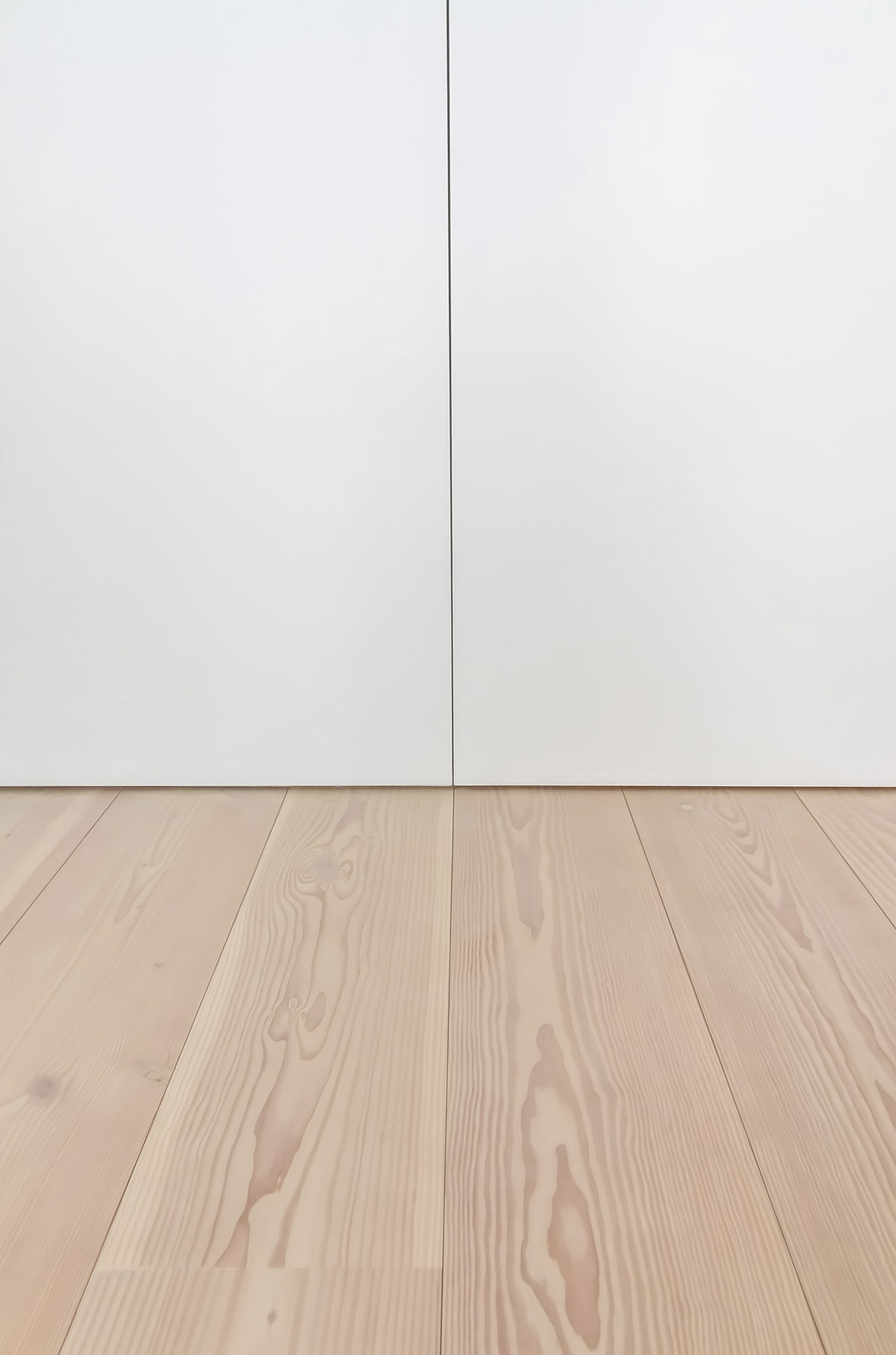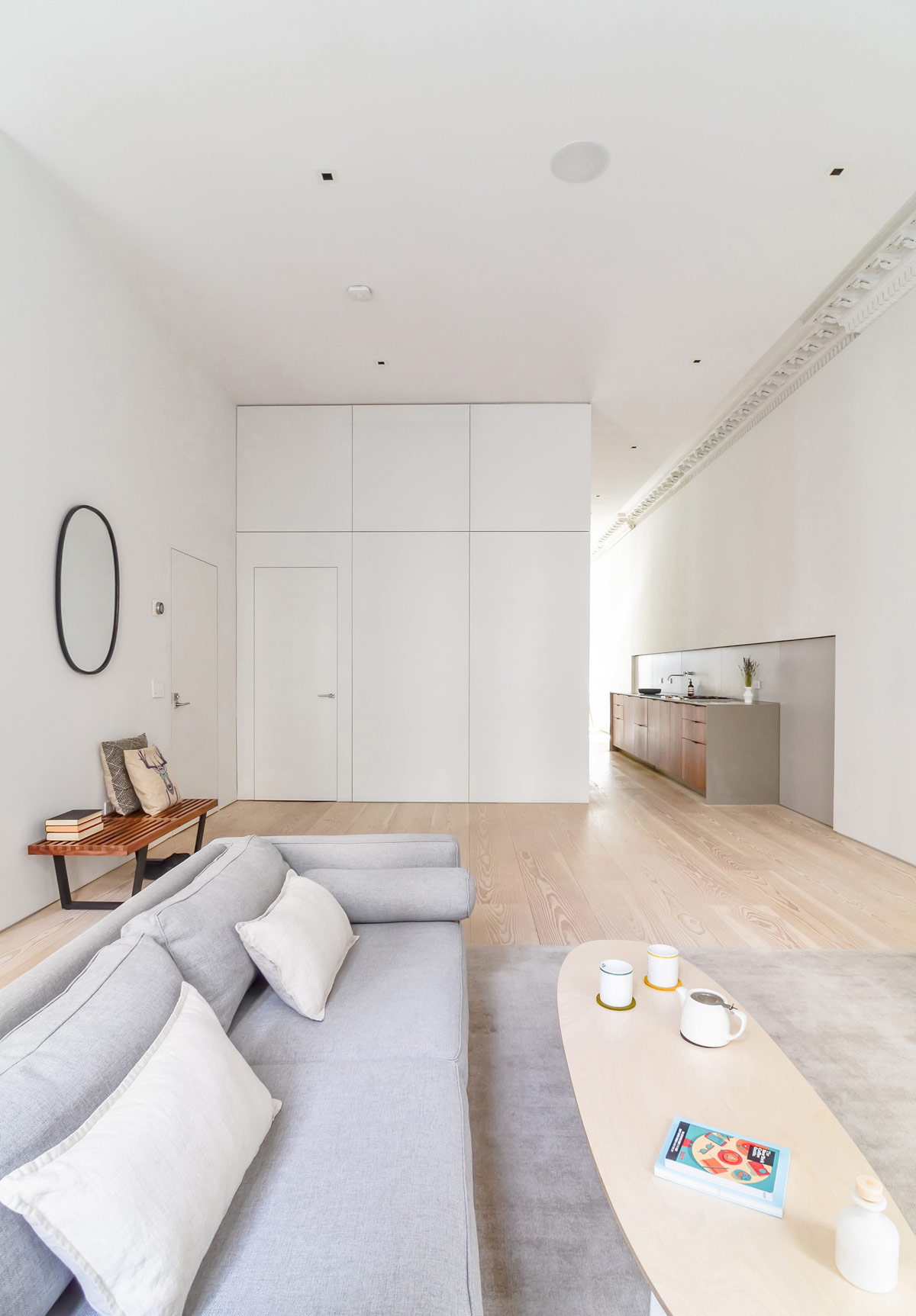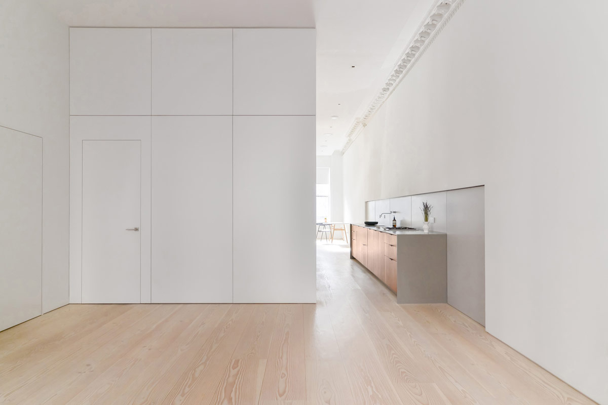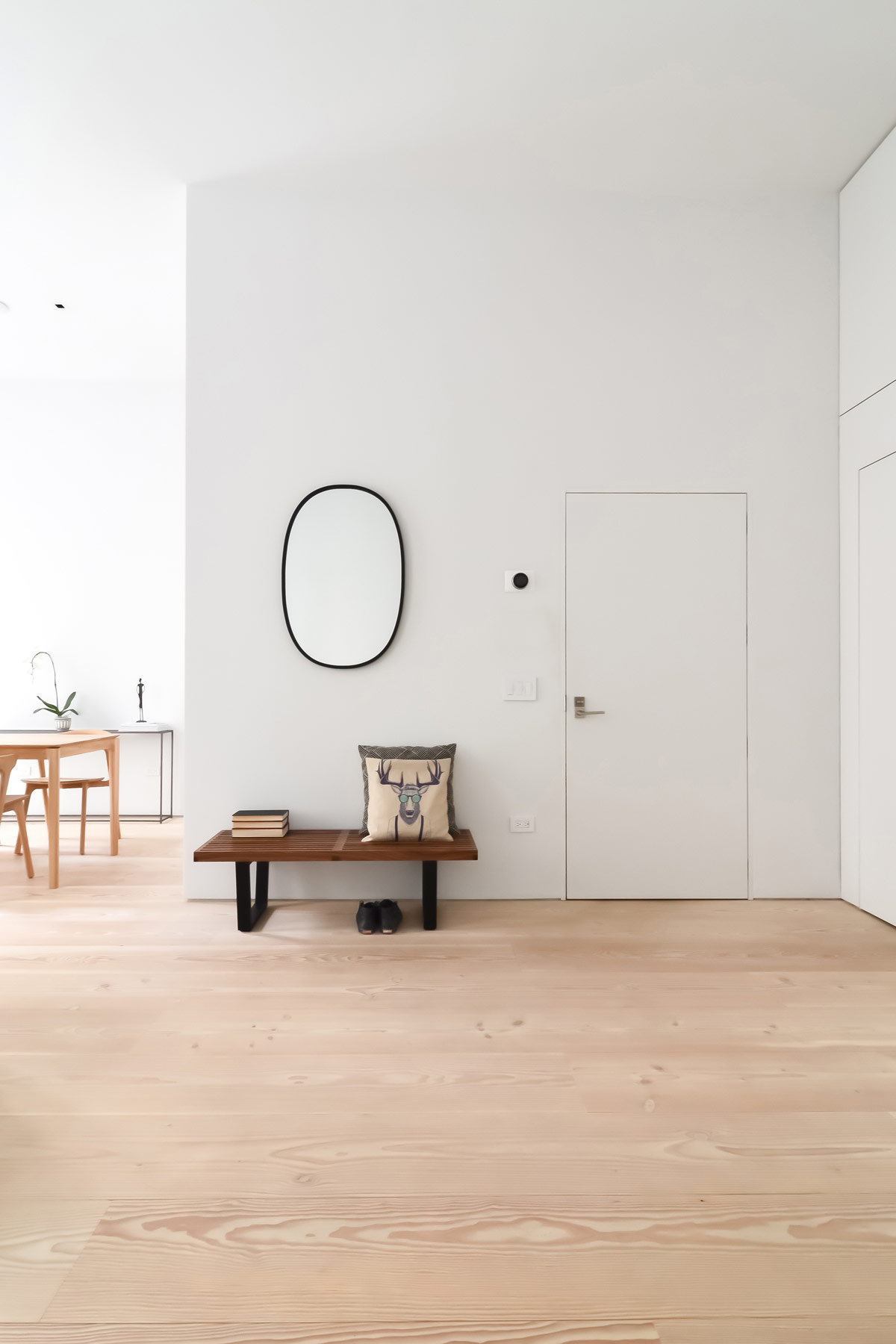 收纳柜的门与白色的墙面保持在同一平面,且柜子底部与地板齐平,避免了踢脚线增加的线条。嵌入式的手柄既简化了安装的过程又使收纳柜整体与墙面融为一体,维持了房间整体的简约设计。
