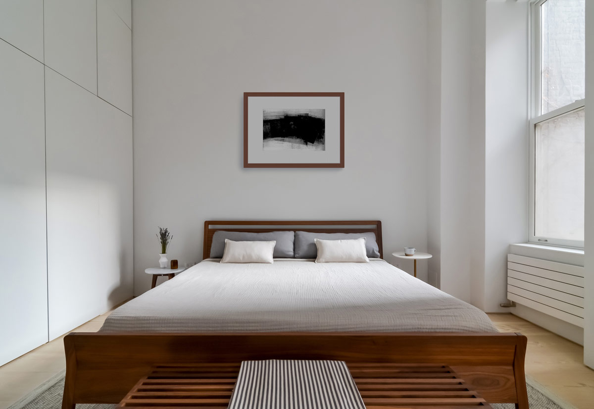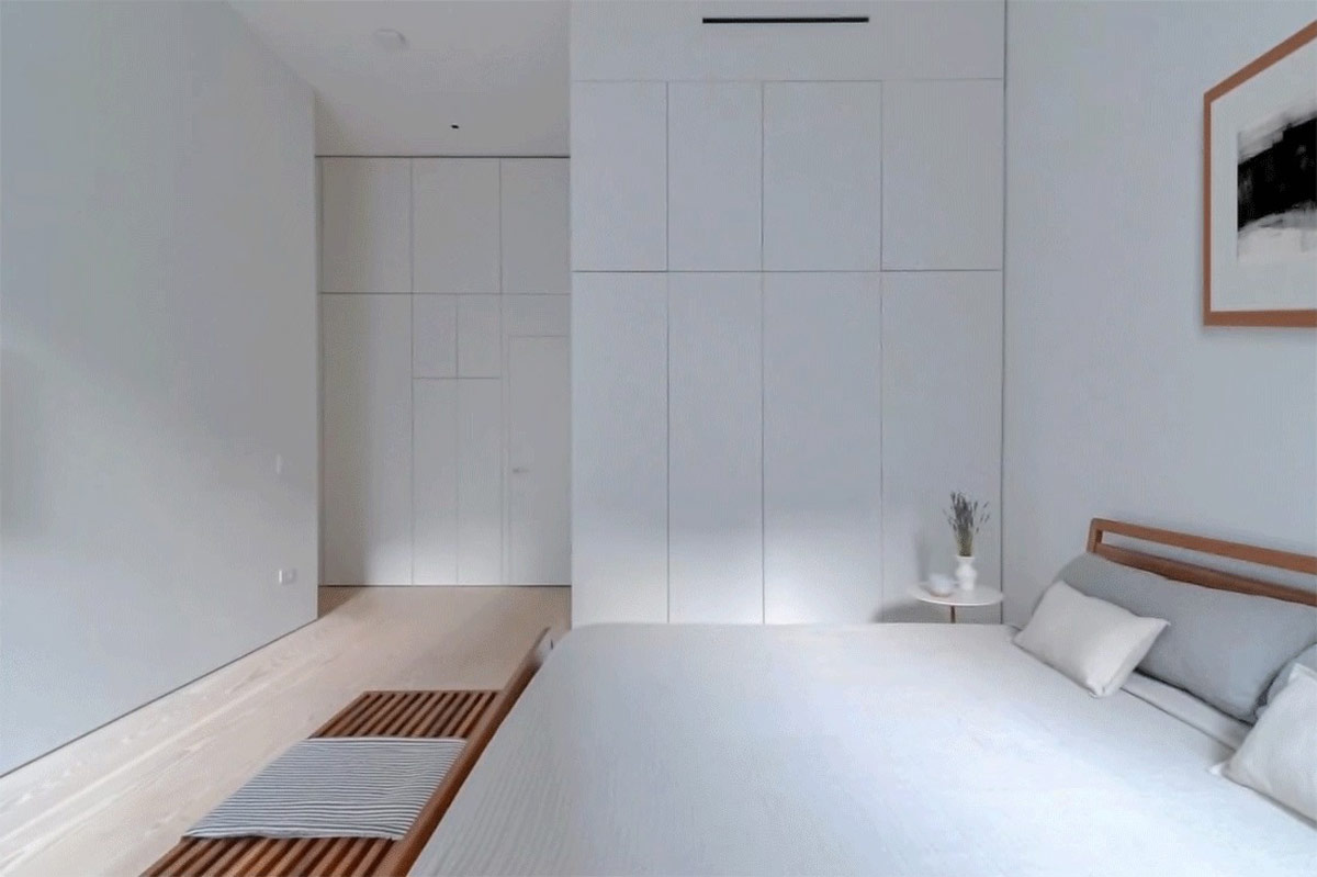 卧室继续采用简约的风格,房间里的家具陈设松散而不拥挤,白色的衣柜与墙面融为一体。没有过多的修饰,视觉上一体化的设计给人一种舒适自然的感觉。