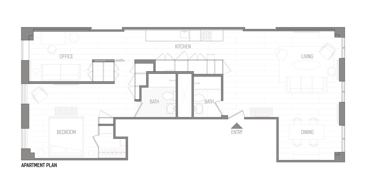 最后,整套房屋设计的压轴特色就在于空间的分割没有直接采用墙体作为隔断而是选择了以空间隔断空间。可以看到卫生间和厨房将客餐厅和休息区划分成两个独立的空间,卫生间一个面向客厅一个面向休息区,既将整个房屋分为公共空间和私人空间,又能满足两个空间的功能需求。而厨房就分列在这个过道的两侧,既节约了空间,又有另一番情调。