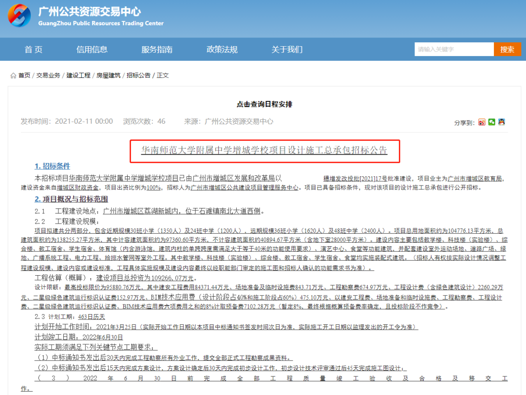 广州公共资源交易中心发布了关于华南师范大学附属中学增城学校项目设计施工总承包招标公告。