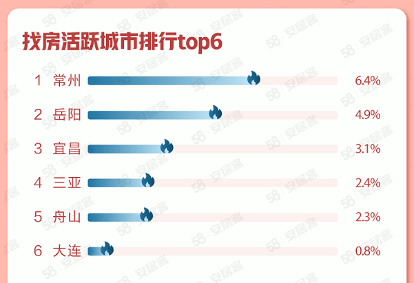 2022年1月正值春节前夕,全国找房热度出现一定程度降温,环比去年12月下跌7.7%,其中一线城市找房热度环比下跌4.2%,二线城市找房热度环比下跌8.5%,三、四线城市找房热度环比下跌7.9%。常州、岳阳、宜昌、三亚、舟山和大连等城市相对活跃,找房热度环比均有所上涨。