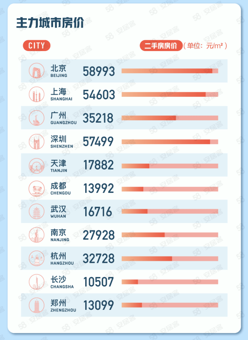 报告显示,1月全国65个主要城市二手房挂牌均价为16888元/㎡,环比微涨0.35%,65城中有38城挂牌均价环比上涨。其中,北京、深圳、上海二手房挂牌均价分别为58993元/㎡、57499元/㎡和54603元/㎡,广州为35218元/㎡。