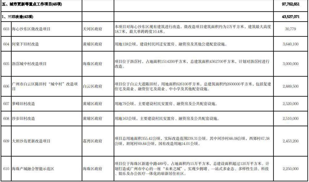 城市更新等重点工作项目共48项,其中三旧改造共42项,总投资额约435.27亿元。黄埔依旧是广州旧改的主力,共有10条村列入重点项目中,包括何棠下、萝峰、沙步、汤村、火村、刘村格岗片区、黄陂社区长安片区、大塱、横沙和凤尾旧村;