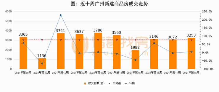 进入2024年第48周(11月25日-12月01日),广州新建商品房成交3253套,较上周增加181套,环比上涨5.9%