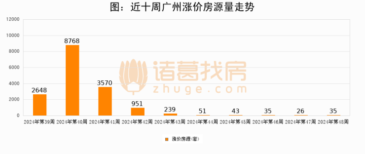 从调价房源来看,第48周广州涨价房源35套,较上周上涨34.6%。与此同时,48周涨价房源占比提升3.07个百分点,业主信心持续恢复。