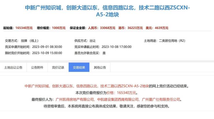 广州公共资源交易中心官网显示,中新广州知识城两宗相邻涉宅用地成功出让,合计成交金额约30.1亿元。