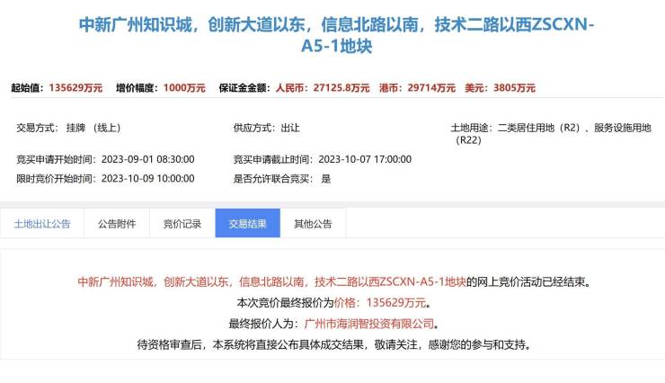 分地块来看,中新广州知识城创新大道以东,信息北路以南,技术二路以西ZSCXN-A5-1地块由广州市海润智投资有限公司以135629万元竞得,企查查显示该公司由国企广州开发区投资集团有限公司100%持股。