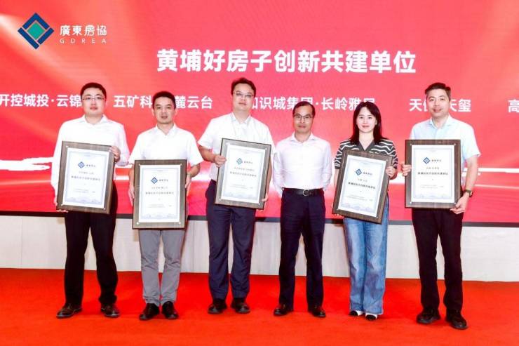 在大会上,广东省房协宣布将正式开启与各个项目共同打造黄埔“好房子”的创新共建合作关系。由广东省房协王韶会长上台为开控城投·云锦、五矿科城·麓云台、知识城集团·长岭雅居、天健·天玺、高新·仕林苑 五个项目颁发“黄埔好房子创新共建单位”证书。