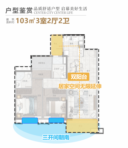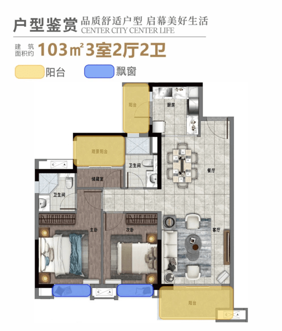 以建面约103㎡户型为例,其含阳台、飘窗在内的使用面积,就多达5处,以创新高拓展,满足菁年百变的个性表达。