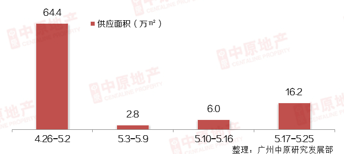 相比之下,原计划有多个项目达到入市阶段的黄埔,本月仅获批10.1万㎡(1028套)单位,且60%的推新货量为五一假期前推出,五月中下旬该区“僧多粥少”问题加剧;此外,根据媒体报道,番禺、天河、南沙等“热区”项目预售证发放亦受到一定客观情况影响,部分项目只能暂缓开盘推新计划。从新批时间结构来看,本月72%的推新面积集中在4.26-5.2(五一假期及前夕), 随着节后楼市调控手段趋严,新批供应量放缓明显,直至最后一周才略有改善。