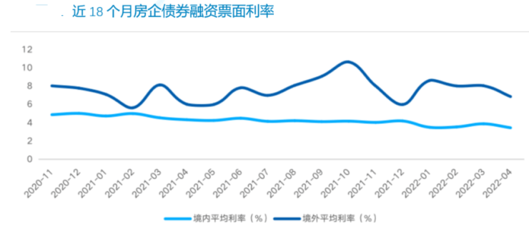一个值得注意的现象是,境内、外债券规模占比差距正在逐步拉大。贝壳研究院数据显示,1-4月境外债券规模约442亿元,同比减少65%,其规模占比进一步下滑至19%,较2021年同期下降13个百分点;境内融资规模约1908亿元,同比减少30%,其规模占比提升至81%。