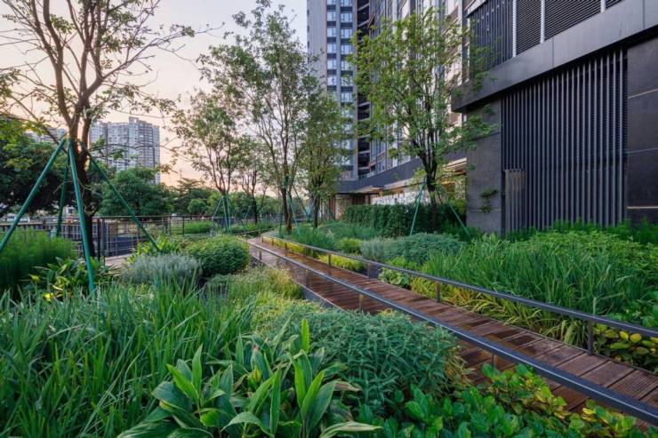 与项目相邻的白云山生态屏障和社区内精心打造的瑰丽园林相映成趣。园林内臻选种植了朴树、红果冬青、黄皮、大腹木棉等名贵树种,打造"一步一景"的沉浸式体验。这里的四季流转成为孩子们认识自然的活教材——春赏风铃木,夏观火焰木,秋品冬青树,冬沐暖阳草坪,让自然教育融入日常生活。住在这里,可以利用周末时间,带着孩子在园区内进行植物观察、写生创作,将课堂延伸到户外。