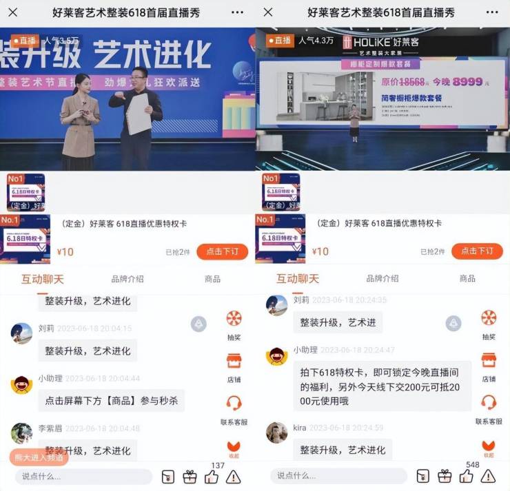 开场5分钟,第一轮礼包福利瞬间秒空,在直播间粉丝们的热情燃动之下,整装项目部销售总监李硕更是放出大招为广大粉丝朋友们上架了618特权卡,带来5大重磅福利:①可参与618当天直播间“秒杀产品”; ②6月25日前可以在线下好莱客艺术整装门店购买直播的“劲爆价产品”; ③在线下艺术整装门店领取精美礼品一份; ④直播当天线下交200元抵2000元; ⑤服务升级,设计总监参与全屋设计指导。