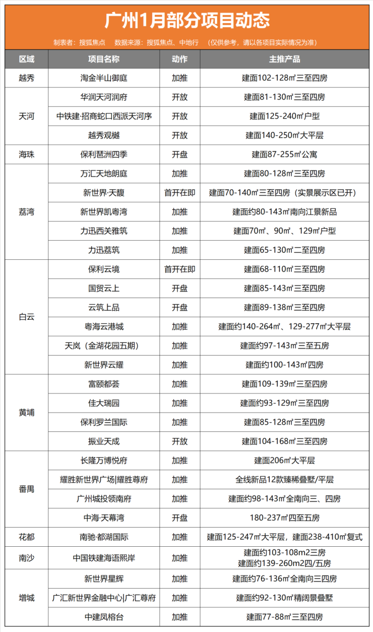 节前已有新盘抢跑,如新世界·天馥元旦前开放实体样板间、保利云境开放营销中心,提前蓄力;亦有新盘如保利琶洲四季、国贸云上、广州地铁地产·云筑上品、中海·天幕湾等预计1月正式开卖。