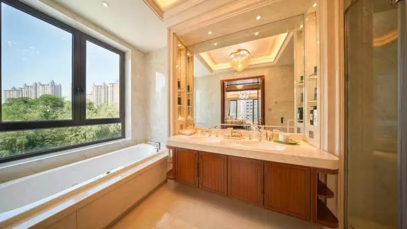 定制级盥洗室,双台盆设计,干湿分区,隔绝水汽与卧居生活,躺在浴缸中,洗去岁月铅华,感叹生活的幸福与美妙。
