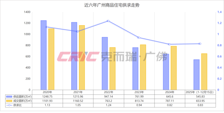 克而瑞数据监测显示,2025年1-12月15日,广州商品住宅供应面积545.83万㎡,成交面积653.95万㎡,供求比0.84,从走势图可见,近三年来广州商品住宅供求比均小于“1”,市场供求关系正持续改善。