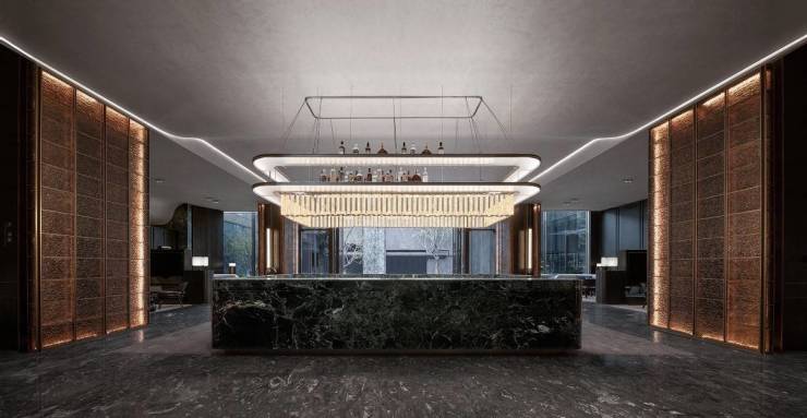 从显赫的门庭到归家的礼序,历经全球臻选,铺陈全球九大世界奢石,将奢华植入圈层名流的日常。社区入口臻选稀缺全块青云石以水刀切割拼花工艺嵌入金属线条铺设,寓意“平步青云”;设有非洲蓝翡翠铺陈的5.5米挑高入户大堂背景墙,单平造价即要5位数。