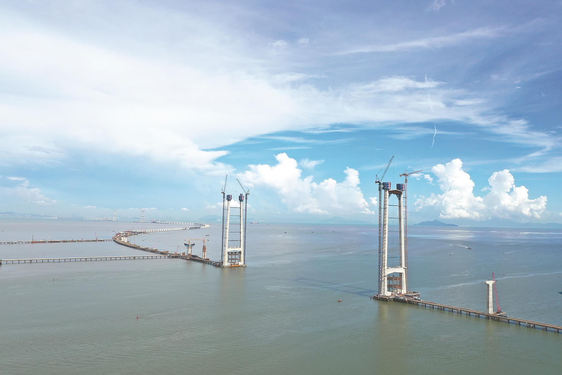深中通道是集“桥、岛、隧、水下互通”为一体的高级跨海集群工程,全长24公里。其中,桥梁工程长约17.2公里,其关键控制性工程为主跨1666米的伶仃洋大桥与主跨580米的中山大桥。到中秋佳节当天,深中通道伶仃洋大桥、中山大桥“双桥四主塔”全部封顶,全面转入上部结构施工阶段。