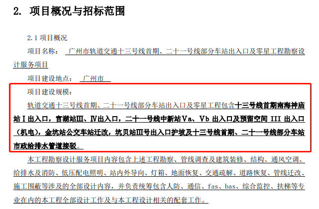 昨天,广州公共资源交易中心发布了《广州市轨道交通十三号线首期、二十一号线部分车站出入口及零星工程勘察设计服务项目公告简要》。