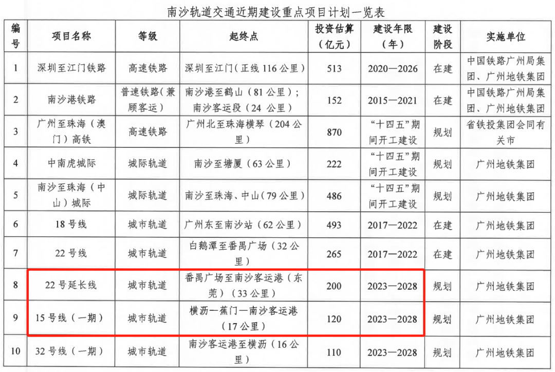 此外,根据《南沙综合交通枢纽规划(2020—2035年)》显示,15号线和22号线南延段的建设年限都为2023-2028年,两条地铁线的总投资预算约320亿元。