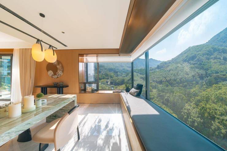 当你走进样板间,当窗帘缓缓打开,四面山景一拥而入的时候,你的眼睛都应接不暇。