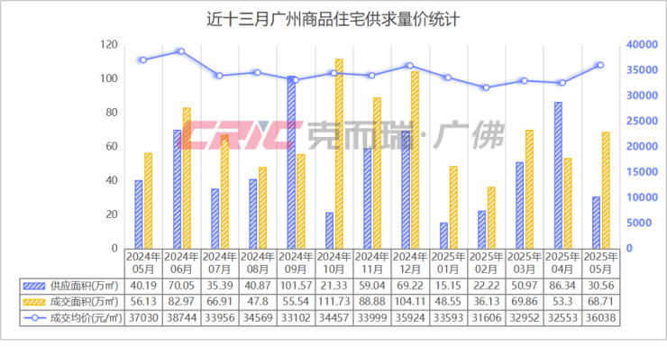 均价方面,克而瑞监测到,五月广州多个中心区改善/豪宅盘大量网签拉升整体均价,最终录得成交均价36023元/㎡,环比上升10.7%,同比下跌2.7%。