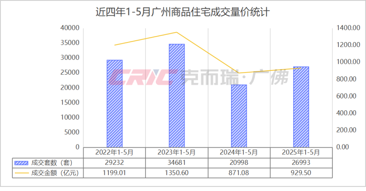 综合前四月的表现,克而瑞数据监测显示,今年1-5月广州商品住宅累计成交26993套,较去年同时期增长29%,成交金额925.5亿元,同比增长7%。
