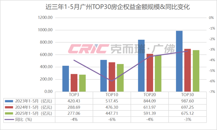 例如今年1-5月,广州权益金额TOP30房企业绩规模675.12亿元,较去年同时期减少3%,降幅环比1-4收窄7%。