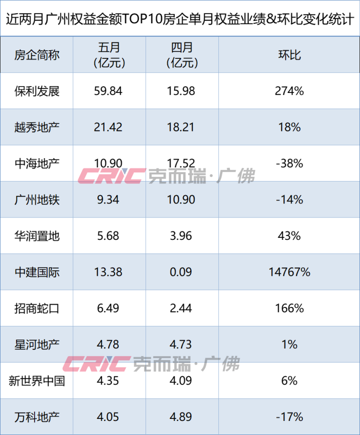 其中,5月份广州房企单月权益业绩,由保利发展摘得桂冠,单月网签成交59.84亿元,环比增长274%,成交主力来自保利天奕等项目。