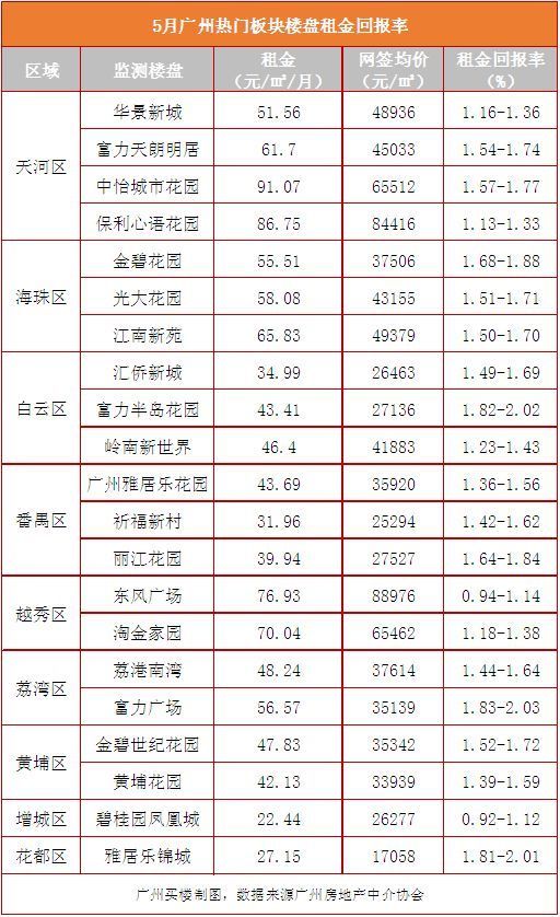 热点楼盘的租金回报率,较高的是荔湾的富力广场和花都的雅居乐锦城,回报率都过了2%。