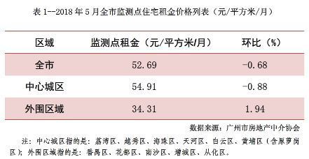 近日,@广州房地产中介协会发布了《5月广州市住宅租金动态监测报告》。报告显示,5月全市监测点住宅租金为52.69元/㎡/月,环比下降0.68%,同比上涨0.38%。其中,中心区租金为54.91元/㎡/月,外围区域为34.31元/㎡/月。
