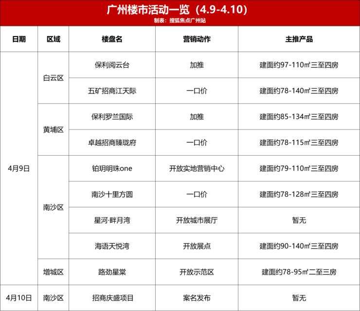 本周末(4月9日-4月10日),据搜狐焦点广州站不完全统计的10盘营销动作中,涵盖开放营销中心、加推等(不涵盖暖场活动),其中比较有看点的是,两大内卷板块——横沥岛和新塘,铂玥明珠one和路劲星棠加剧内卷战局,万顷沙全新盘海语天悦湾开放展点以及庆盛板块排名前列住宅项目案名即将发布!