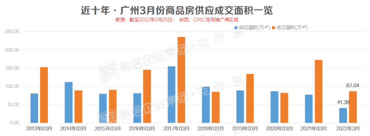 据克而瑞数据显示,3月份(截至25日)广州商品房供应面积41.4万方,成交面积87万方,成交金额266.5亿元。