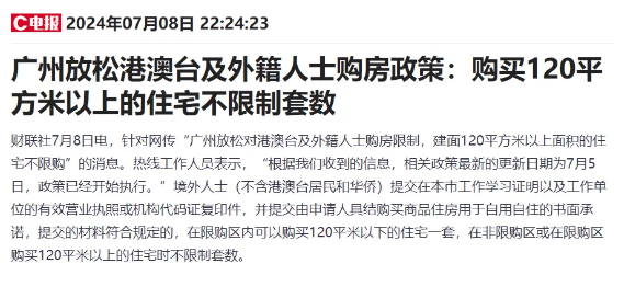 日前关于“广州放松对港澳台及外籍人士购房限制,建面120平方米以上面积的住宅不限购。” 被证实。