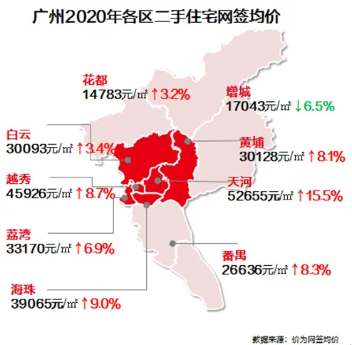 2020年广州二手住宅网签均价为28815元/平,同比去年上涨7.8%。从各区网签均价来看,涨幅明显主要集中中心区天河、海珠、越秀等热点区域,涨幅分别达15.5%、9.0%、8.7%。另外,增城区网签均价不升反降,同比下跌6.5%,由于其规划利好价值已被提前消化,加上其他区人才新政升级抢客,变相削弱增城限购优势,导致客户入市热情暂时回落。