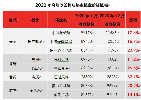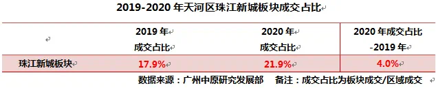 此外,据广州中原研究发展部调研监测,2020年,珠江新城板块成交活跃度明显上升,成交占比从去年的17.9%上升至21.9%,同比净增4.0%。据了解,在市场火热的情况下,天河珠江新城板块不少业主将放盘价上调5%,而上调10%以上也大有人在。比如,中海花城湾楼盘去年报价基本在9-10万元/平的区间,而目前报价以10-11万元/平区间为主,12万元/平左右的报价亦不在少数。广州中原研究发展部认为,造成这一现象主要有两方面原因:一方面,市场供不应求现象加剧。业主放盘积极性较低,而客户入市热情高,促使二手楼价明显上调;另一方面,在目前临近的深圳限购政策的升级,加上整体金融环境不如人意,促使不少资金实力雄厚的投资客将目光转移至珠江新城板块具备保值能力的楼盘上,促使整体市场需求有所上扬。