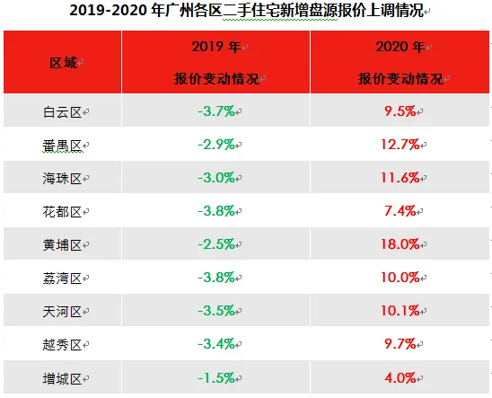 (2)楼市明显分化,局部板块成交火热。2020年二手楼市出现明显分化,部分如天河珠江新城、越秀东风东等高端板块需求较去年同期大增,以至于不少业主借此机会上调报价,基本不存在议价空间。而大社区刚需板块则供需平衡,价格相对稳定,如祈福新村、碧桂园凤凰城等。目前刚需盘源调价幅度较小。