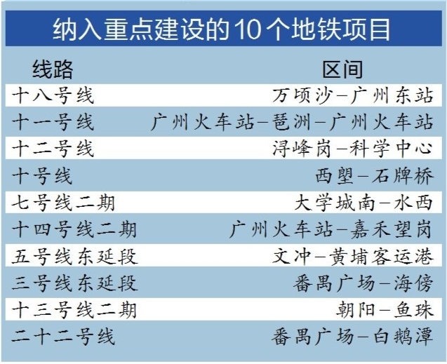 在最受市民关注的轨道交通方面,广州今年将开建南沙至珠海(中山)城际、佛山经广州至东莞城际(广州地铁28号线)、芳村至白云机场城际(广州地铁22号线北延线)和广州东至花都天贵城际(广州地铁18号线北延线)等多条粤港澳大湾区城际铁路。此外,广州今年将开通运营18号线(万顷沙至冼村)和22号线(番禺广场至陈头岗)先通段,实现地铁运营里程突破600公里。