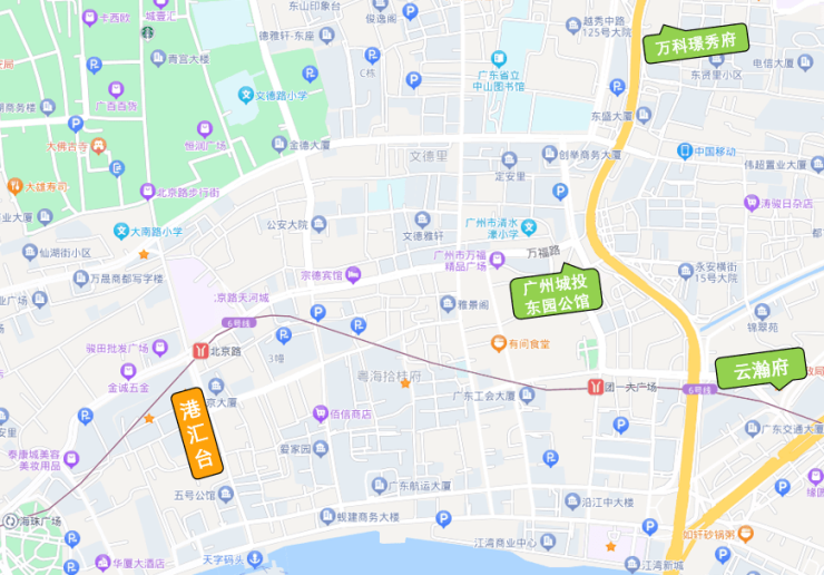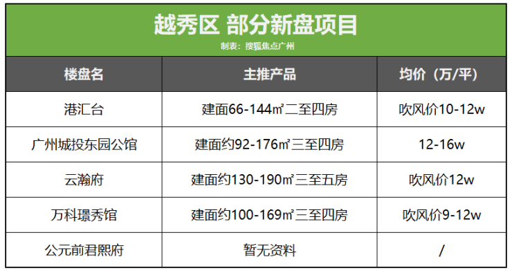 目前越秀区陆续已有5个盘亮相入市。除了港汇台以外,还有广州城投东园公馆、云瀚府、万科璟秀馆、公元前君熙府(该项目目前资料较少,本文暂不展开讨论)。