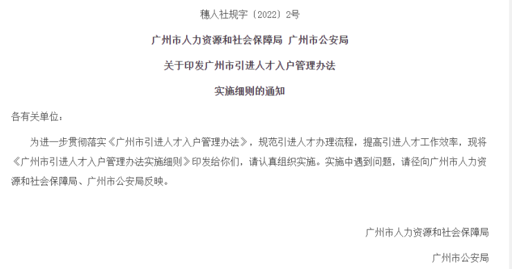 日前,广州市人力资源和社会保障局、广州市公安局印发《广州市引进人才入户管理办法实施细则》(下称《细则》)。