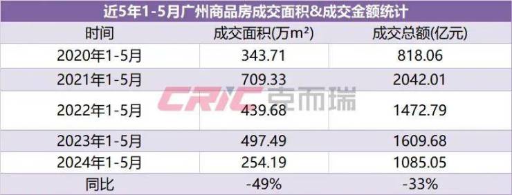 根据克而瑞数据显示,今年1-5月份广州商品房成交面积254.19万㎡,同比减少49%,成交金额1085.05亿元,同比减少33%。