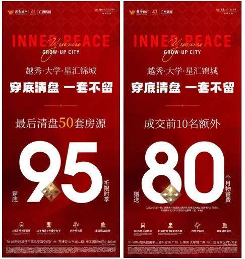 位于番禺的销冠盘越秀•大学•星汇锦城推出最后清盘50套穿底95折起。此外,即日起,成交前10名还可额外赠送80个月物业管理费。