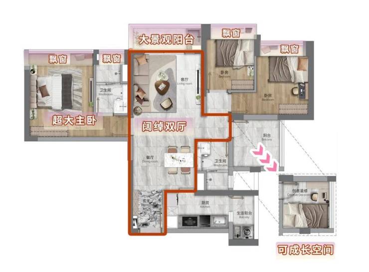 更吸引人的是,相对比项目的三房户型,你只需多付不到10万首付款,就可享有四房一步到位的品质生活。