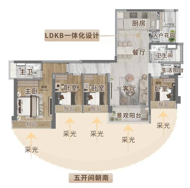 像不限购的建面约126㎡四房户型,五开间朝南,所有房间和客厅都能享受到一样的日照。厨房、餐厅、客厅、景观阳台采用一体化设计,大大减少过道空间浪费,在兼具实用性的同时,还可满足朋友聚餐、家庭互动等多重需求,体现高端生活品质。